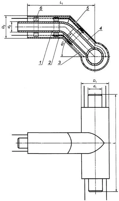 1 — стальной отвод; 2 — оболочка; 3 — проводник—индикатор системы ОДК; 4 — изоляция из пенополиуретана; 5 — электроизоляционная трубка (для труб со стальной оболочкой);6 — центрирующая опора